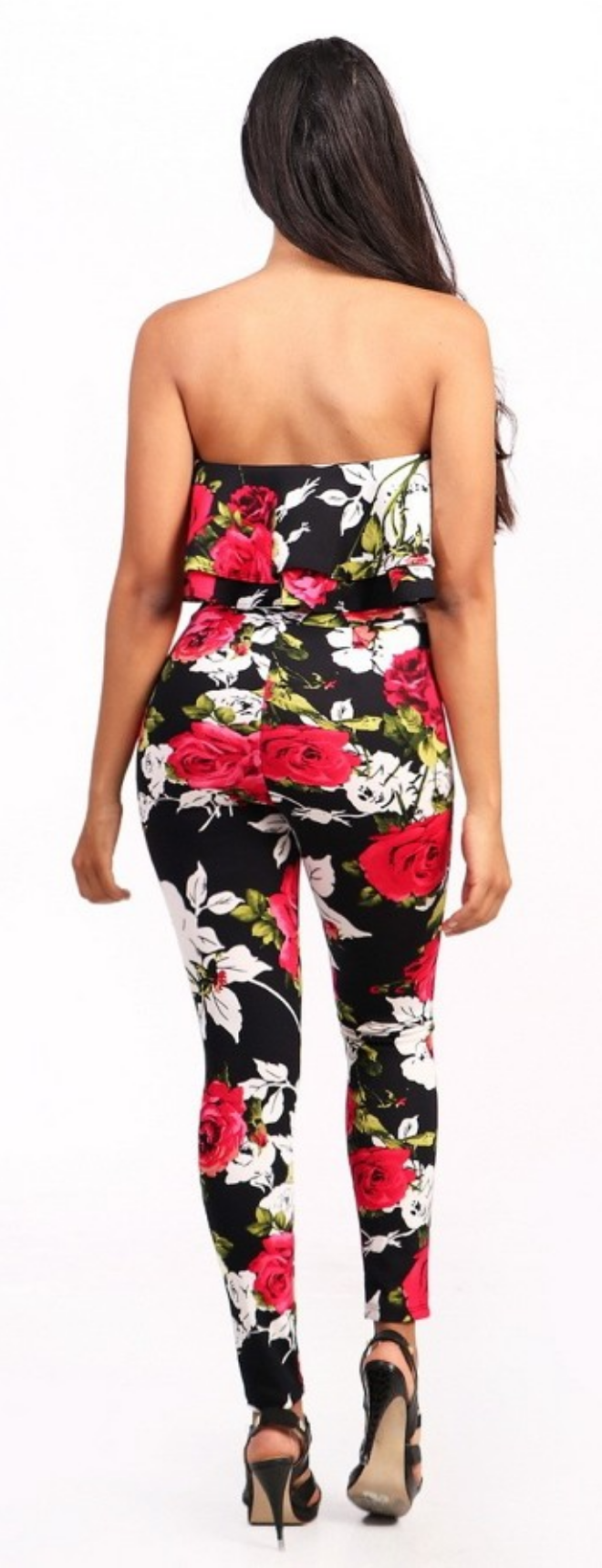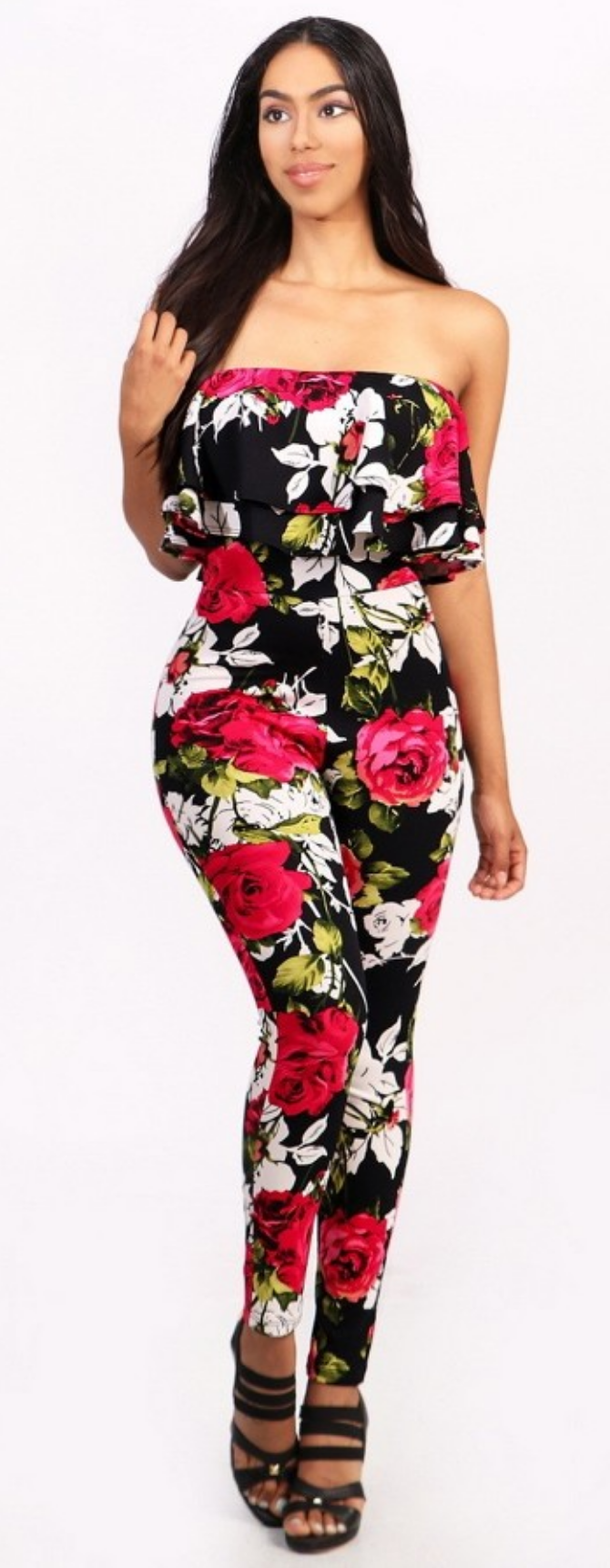 Off shoulder floral jumpsuit with ruffle flare layered top. Content: 96% Polyester 4%Spandex