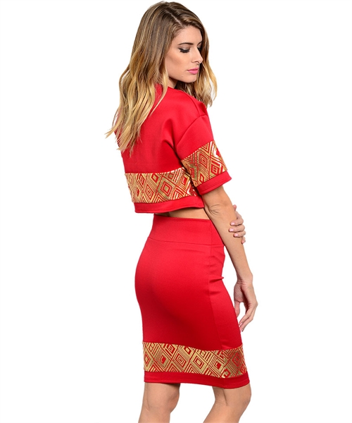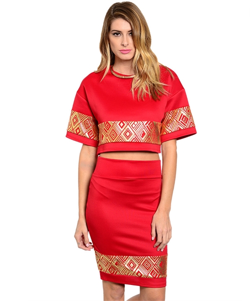 Country: USA Fabric Content: 92% POLYESTER 8% SPANDEX The Kori Set is Reddish Burgundy with Gold Foil Aztec Print. Fun and Flirty!
