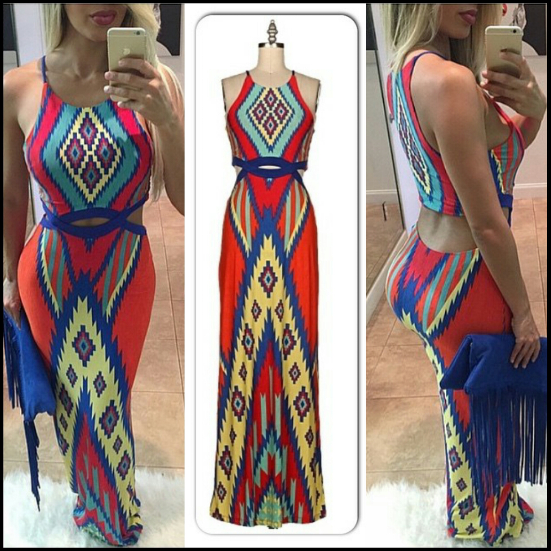 Multi-colored Tribal Aztec diamond print cut out maxi dress. This is the perfect dress for those hot summer nights!