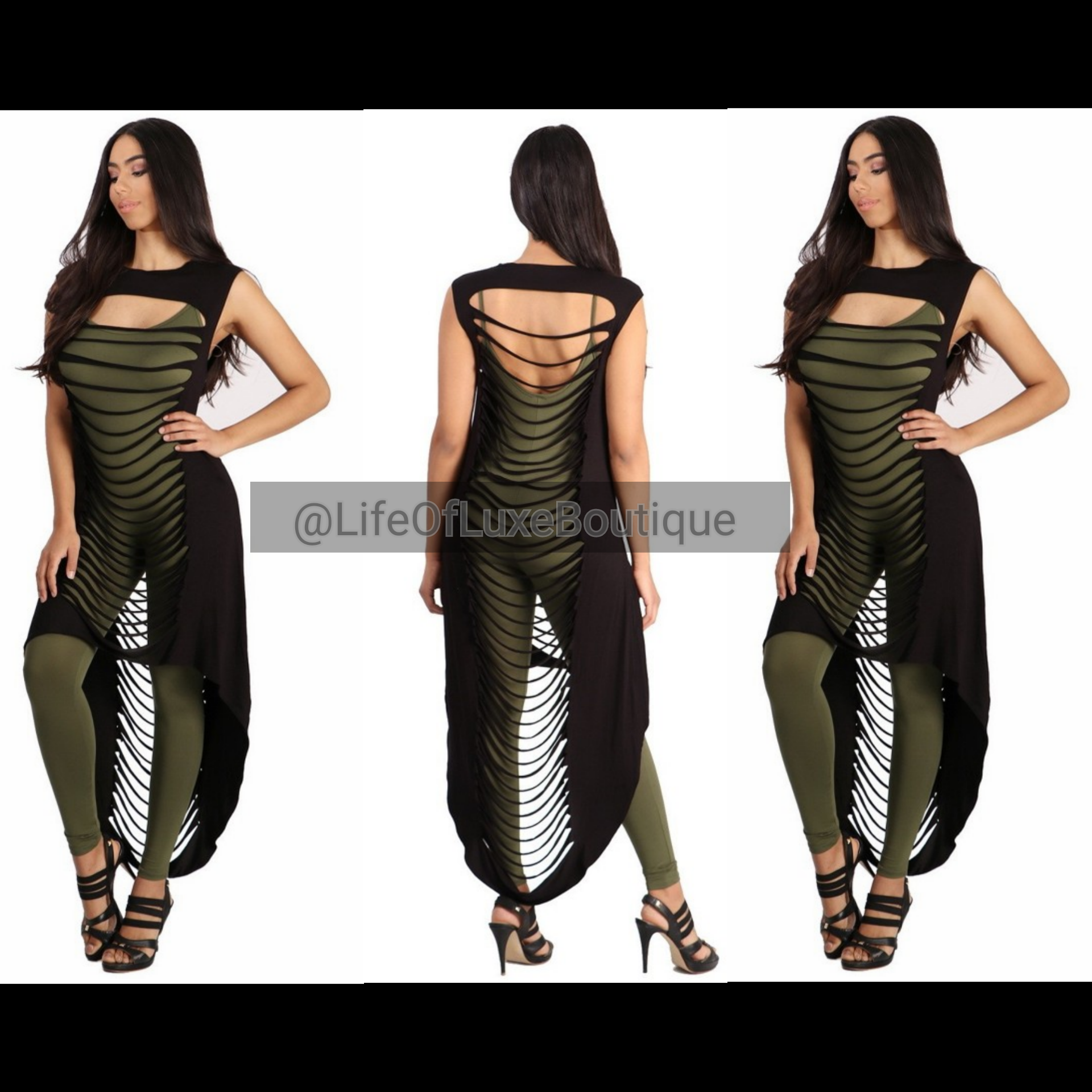 Sleeveless maxi top with cut-outs design. High-and-low style. Content: 96% Rayon 4%spandex