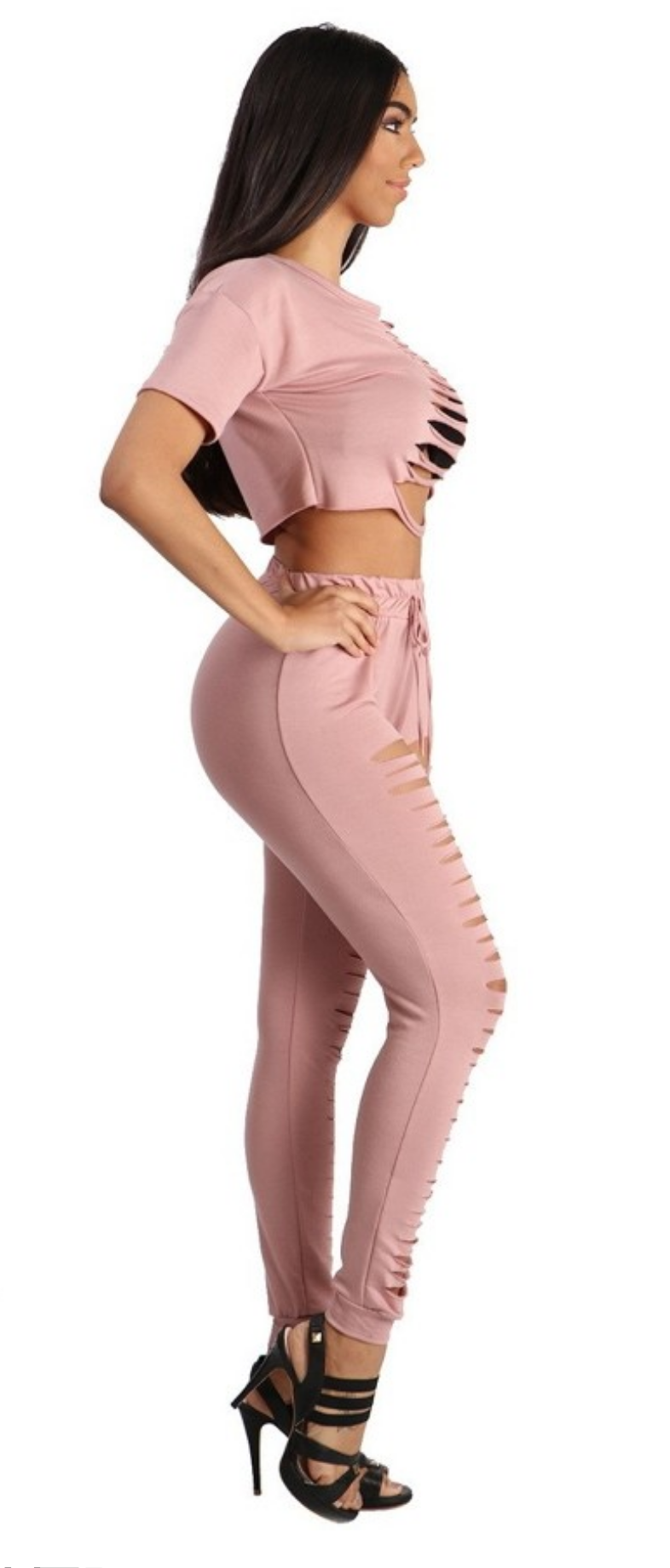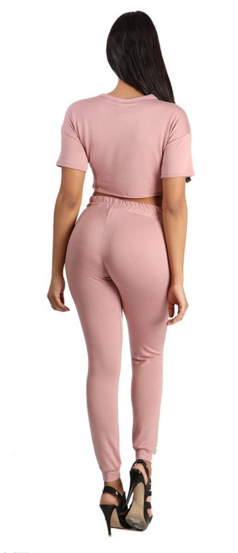 Soft sweats set with cut-out accents on the front. Round neck cropped top with joggers bottom. Elastic band around the waist. Content:80% Polyester15% Rayon 5%spandex