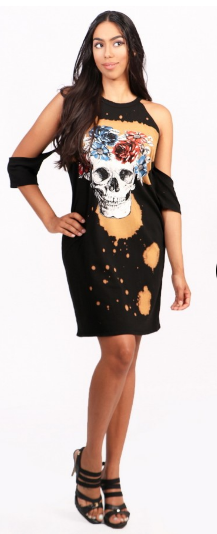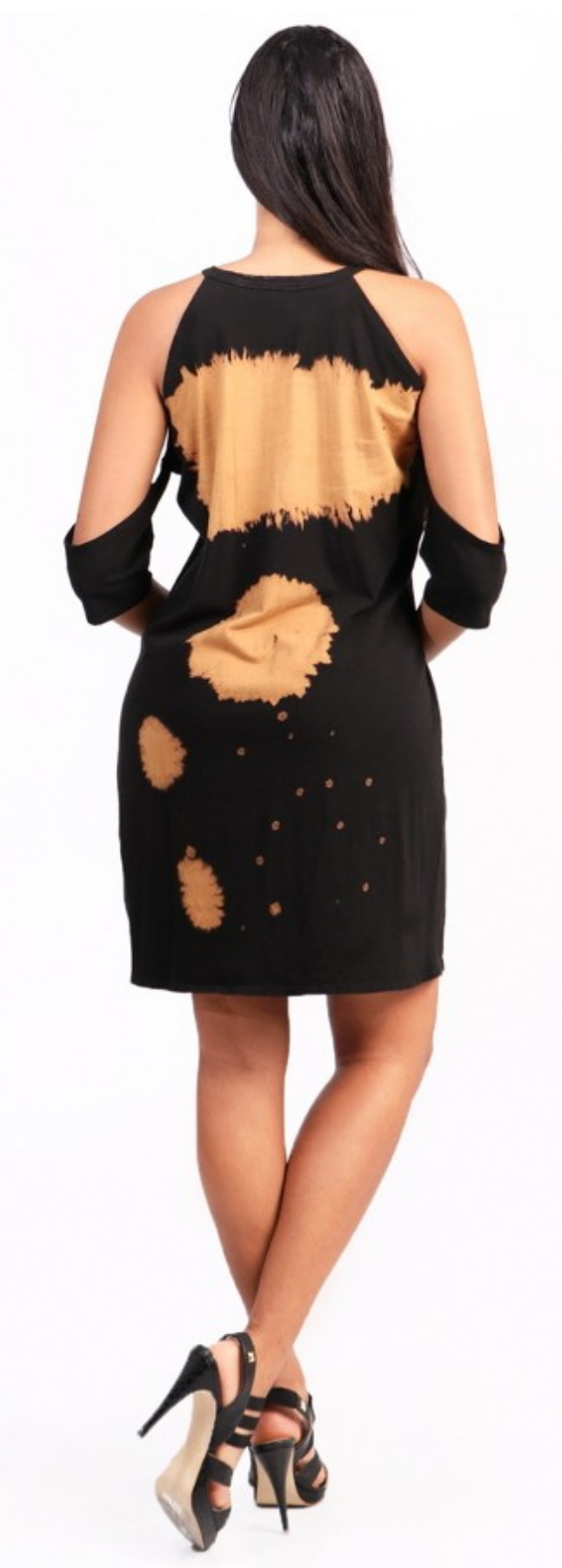 Cold shoulder t-shirt tunic dress with tie dye and print details on the front. Short sleeves. Content: 95% Cotton 5%Spandex